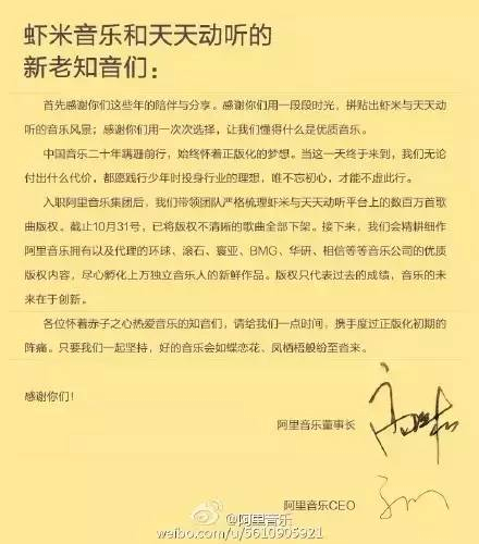 11月的第一天,这一政策正式落地,包括酷狗音乐、酷我音乐、QQ音乐、虾米音乐、天天动听、网易云音乐等音乐平台纷纷通过不同方式发出声明,称全部未授权作品已经下线。11月4日,阿里音乐董事长高晓松与CEO宋柯共同发布声明称,要和大家一起度过“正版化初期的阵痛”。