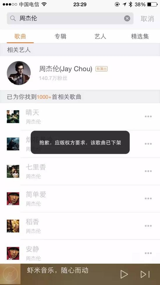 进入11月,在虾米音乐上已没法听到周杰伦、容祖儿、王若琳的歌;而在QQ音乐上,五月天、李宗盛、EXO的歌也已销声匿迹。