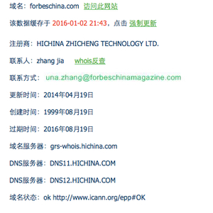 通过对www.forbeschina.com的域名查询,站长之家的查询页面显示,该域名于2016年08月19日到期,但在1月2号已停止缓存。