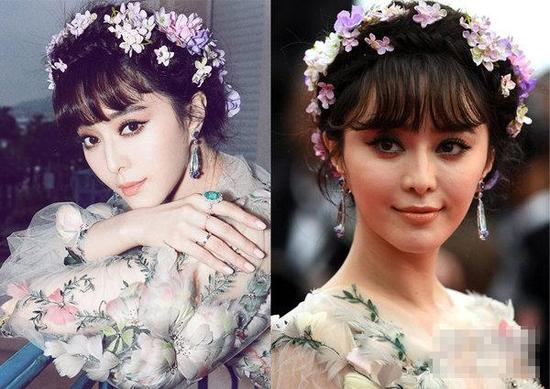 再看看范爷在戛纳的花仙子造型,左边是工作室硬照,右边是现场照,虽然范爷已经很白了但是到了现场没有强光还是瞬间黯淡失色