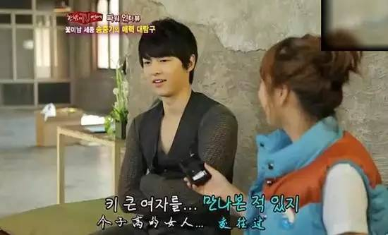 节目中被主持人拷问择偶标准时,宋仲基笑称看女人首先看“曲线美”;被问及“看脸蛋还是身材”时,耿直回答:“我也是男人啊”;还自爆青睐于个儿高的女性,甚至比自己高都可以,平时不爱撒娇,但是对自己的女人会多一点。