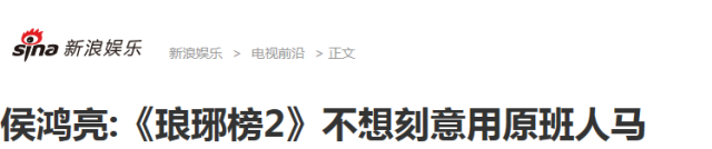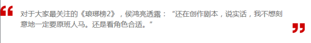 侯鸿亮也表示,《琅琊榜2》目前仍在筹备中,“还在创作剧本。说实话,我不想一定刻意要原班(人马),还是看角色合适。毕竟和第一部的联系不是那么紧密,它讲了一个全新的故事、全新的人物,还是希望能够把戏本身做好。 ”