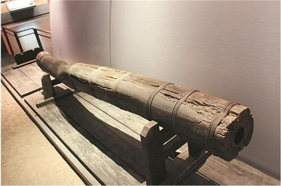 榆木大炮。图为河北省冉庄地道战纪念馆内,陈列着一门民兵用土大炮;它长2.98米,直径28厘米,炮身为榆树树干,内部掏空嵌上铁管,外以铁丝缠绕加固。虽然简陋,却在抗战最困难的时期攻打过日军的炮楼。