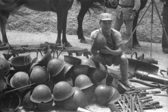 战争初期,据何应钦统计,至1938年12月,国军消耗步、机枪子弹达7.2亿余颗,而当时中国各军工厂月产量不足1000万发。图为缴获的敌人头盔