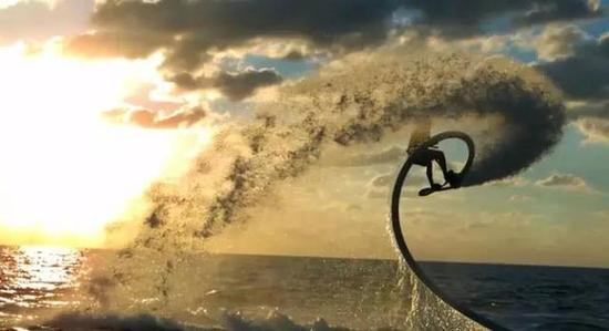它的原理是通过喷射高速海水水流,让滑板在空中“悬浮”起来。
