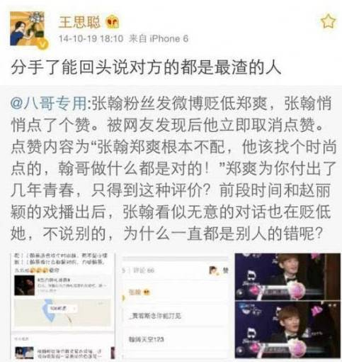 正义小天使思聪老公,在张翰和郑爽分手后也掺和了一下,直接就说张翰是渣男。在有爆料称黄子韬耍大牌后,老公也没有闲着,大爆黄子韬借着交往的名义约炮。