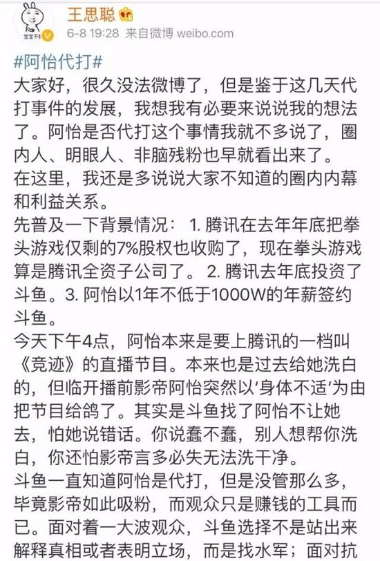 国民老公王思聪这个端午假期真的很忙!先是在距离自己发的上一条微博三个月之后,终于为了#阿怡代打#事件发了微博,并且负责任地发了一条长长长的微博,网友表示并看不懂到底说了些什么,但是由于是老公发的微博,所以不管内容是怎样,跪着都要看完点赞评论!
