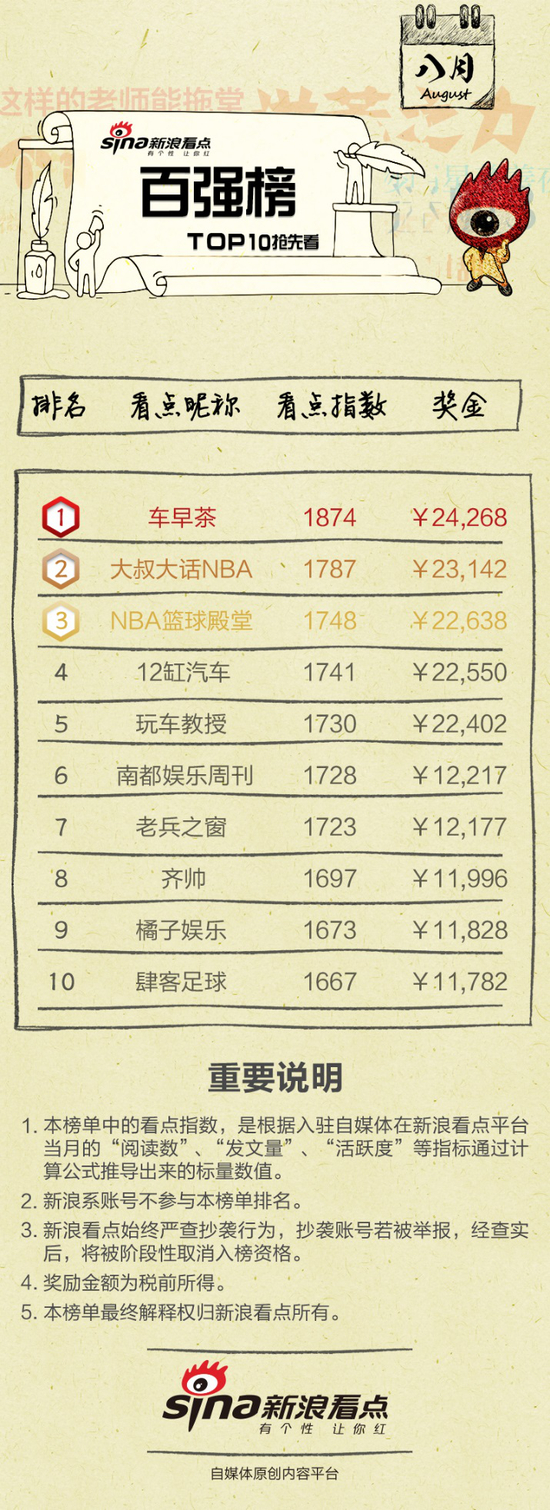 进入9月,眼瞅着中秋国庆假期即将来临,你的心是不是已经飘走了?就在此时!我们热情好客的老板坐不住了,为了让各位自媒体在假期中能愉快地消费玩耍,逐渐实现小V变大V的目标,老板大人决定!提前公布【新浪看点百强榜】,通俗讲就是你离“红”更近了一步!百强席位谁最炸裂?奖金福利都被谁分走了?你的左右蕴藏着哪些未来之星?让我们带着这些疑问进入看榜环节。(PS:本文只展现前十位上榜自媒体,详细百强榜将由新榜官方同期发布,你也许就在上面哟!)