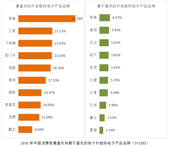 今年,三星虽然仍出现在受访者“最喜欢的外资数码电子产品品牌”排行上,但名次大幅下降到第九。与此同时,其在受访者“最不喜欢的外资数码电子产品品牌”排行上,却冲到了第一,被提及率为50.7%,比第二名高出将近一倍。