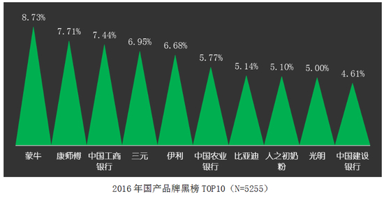 黑榜则由去年的第一蒙牛继续“领跑”,康师傅、伊利、三元、中国工商银行、韩束、中国农业银行、人之初奶粉、众泰汽车和贝因美位列第二到第十。