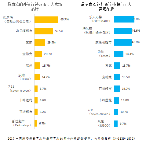 去年并未登上任何榜单无存在感的乐天玛特,今年却一路冲进了受访者最不喜欢的外资品牌第八位。在受访者最不喜欢的“外资连锁超市、大卖场品牌”榜单上,乐天也位居第一位。