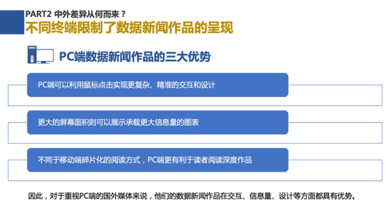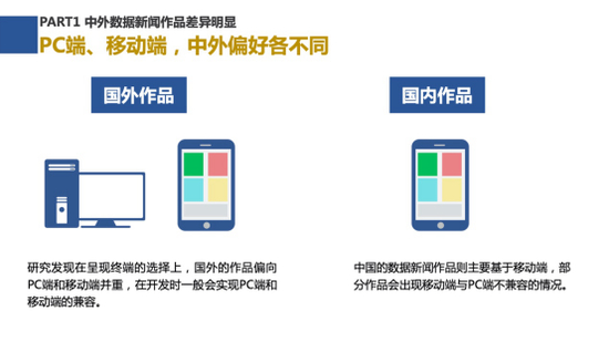 研究团队经对比发现,国内外数据新闻作品在呈现终端选择(PC端、移动端)、可视化设计偏好(静态呈现、动态互动)、数据引用规范、数据源开放程度和数据挖掘能力上均存在差异。例如在呈现终端的选择上,国外的作品PC端和移动端并重,在开发时一般会实现PC端和移动端的兼容。而国内的数据新闻作品则主要基于移动端,部分作品会出现移动端与PC端不兼容的情况。