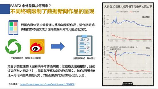 在分析“为何中国数据新闻报道作品类型主要是投放在移动端的信息图”这一现象时,研究认为,国内移动端用户规模庞大、具有巨大的营销价值和潜力。例如微博和微信公号是国内媒体数据新闻呈现与传播重要的路径,这深刻影响了国内数据新闻的表达方式。因此,适合移动端传播的静态图文成了国内数据新闻常见的呈现方式。