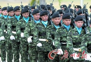 8月21日,在泰国春武里省,泰国新当选总理巴育造访第二步兵营第21步兵团时检阅仪仗队。