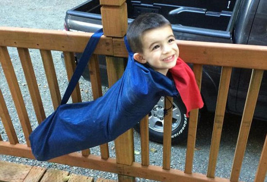 这个小超人被卡在了椅子中间,不过这个位置可是不够帅啊。(图片来源:英国媒体)