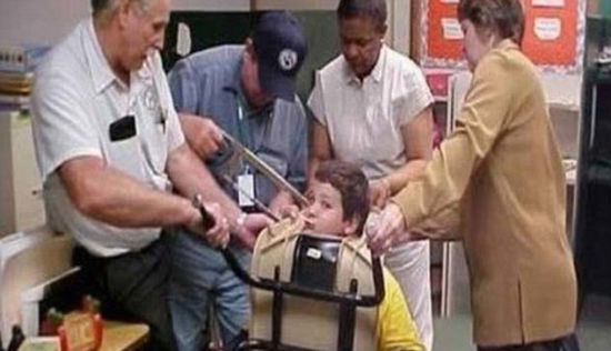 这个小男孩被卡在了塑料椅子里,只有锯开椅子才能出来。这好像也是个逃学的办法。(图片来源:英国媒体)