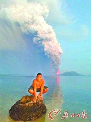 当地居民已经习惯火山喷发,与身后正在逐渐喷发的塔弗弗火山淡定合影。