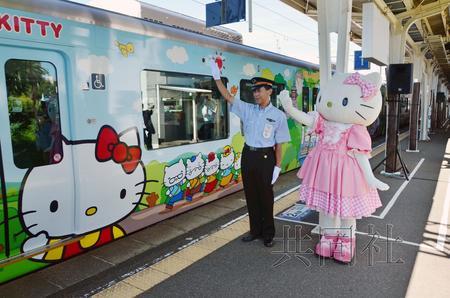 车身印有“凯蒂猫”的列车从新宫站发车。