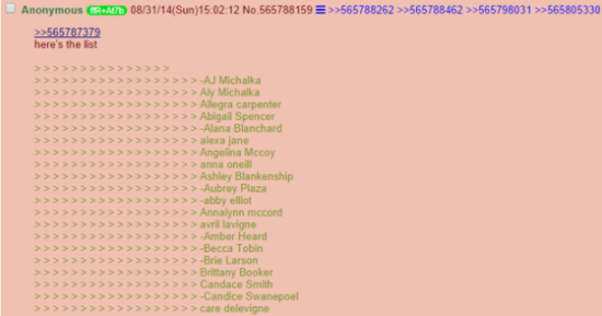 周二早些时候,在美国的讨论版4Chan上,有用户发布了这些照片,并称这些照片是黑客攻击了多个iCloud账号之后流出的。有裸照的明星包括维多利亚-嘉斯蒂(Victoria Justice)、埃米莉-布朗宁(Emily Browning)、凯特·波茨沃斯(Kate Bosworth)、珍妮-麦卡锡(Jenny McCarthy)和凯特-阿普顿(Kate Upton)。
