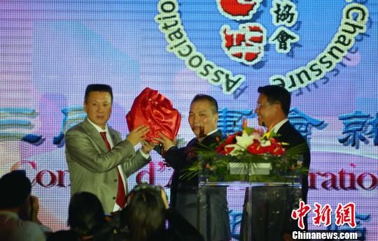 法国华人鞋业协会第三届理事会就职典礼5日晚在巴黎举行,曾长期担任该会第一副会长的郑建国(中)从连任两届会长的赵青(左)手中接棒,正式就任新一届理事会会长 龙剑武 摄