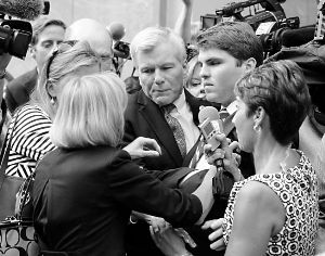 9月4日被裁定贪腐等罪名成立后,前弗吉尼亚州州长罗伯特·麦克唐纳(中)在庭外被记者包围。