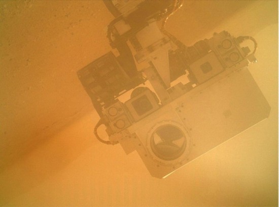 2012年9月7日,“好奇”号用安装在机械臂末端的火星手持透镜成像仪拍摄的自拍照,遥感桅杆、化学与摄像机仪器、2台桅杆相机以及4台导航相机均在照片中出现。