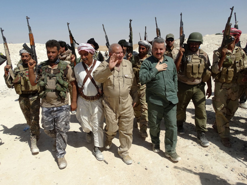 7日,伊拉克安巴尔省省长艾哈迈德·杜莱米(前右三)在视察省会拉马迪以西一处军事哨所时,遭遇“伊斯兰国”武装分子炮击,杜莱米负伤。在送医途中,杜莱米的车队又遭遇自杀式袭击,导致1名士兵死亡,6人受伤。
