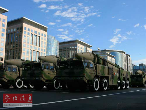 资料图片:2009年10月1日,首都各界庆祝中华人民共和国成立60周年大会在北京天安门广场隆重举行。这是某新型中远程地地常规导弹方队在长安街行进。