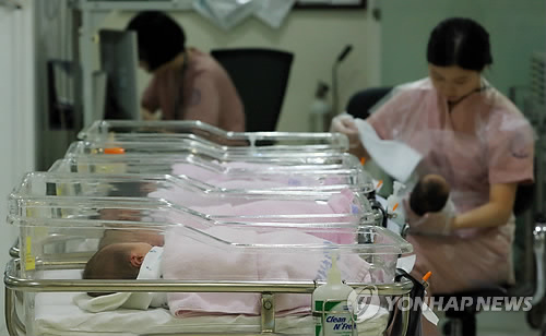 资料图片:图为首尔市中心一家医院的婴儿房。摄于2014年7月。(韩联社)