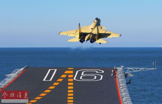 资料图片:2012年11月25日,歼—15舰载机在航空母舰“辽宁舰”上滑跃起飞。 新华社记者 查春明 摄
