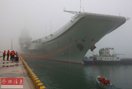资料图:2013年2月27日上午,中国首艘航空母舰辽宁舰首次靠泊青岛某军港。