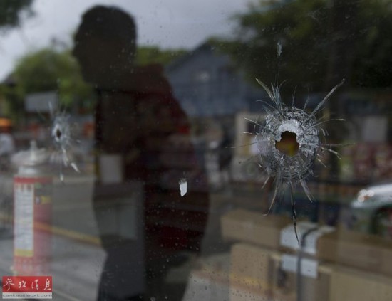 5月24日上午在美国南加州圣巴巴拉县枪击事件现场拍摄的一家超市窗户上的弹孔。新华社记者杨磊摄