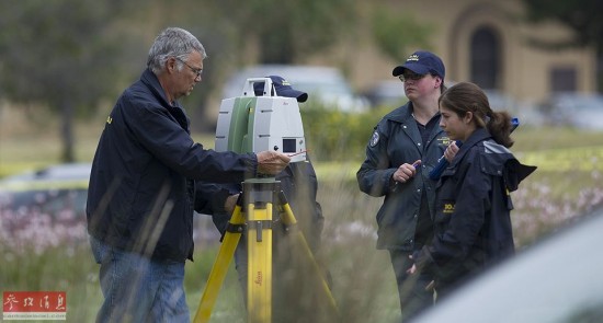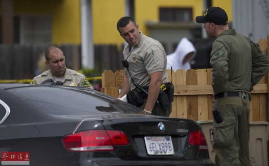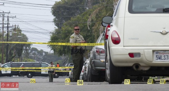5月24日,在美国南加州圣巴巴拉县,警察在枪击事件现场勘查。新华社记者杨磊摄
