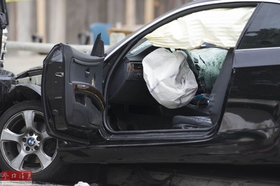 5月24日在美国南加州圣巴巴拉县枪击事件现场拍摄的嫌疑人所乘汽车。新华社记者杨磊摄