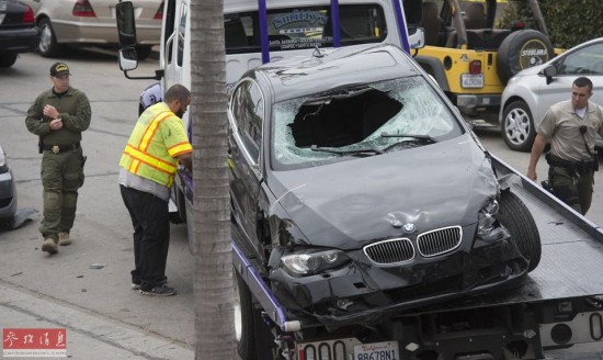 5月24日,在美国南加州圣巴巴拉县,警察拖运嫌疑人所乘汽车。新华社记者杨磊摄
