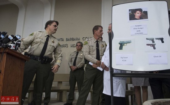 美国加利福尼亚州圣巴巴拉县的加州大学圣巴巴拉分校附近街区5月23日晚发生枪击事件,造成包括嫌疑人在内的7人死亡,另有7人受伤。美国南加州圣巴巴拉县警察局长比尔·布朗在24日的新闻发布会上说,嫌疑人名叫埃利奥特·罗杰,年仅22岁,是圣巴巴拉城市大学学生,23日晚刀杀3人后又枪杀3人。嫌疑人在与警察枪战后身亡,死因仍未确定。这是5月24日美国圣巴巴拉警察局公布的嫌疑人所用枪支照片。新华社记者杨磊摄