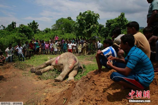 当地时间2014年8月7日,印度高哈提,一头野生大象在寻找食物过程中触电身亡。据了解,当地村民为了驱赶野生动物,在村落附近布非法电栅栏保护。