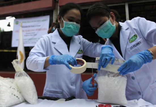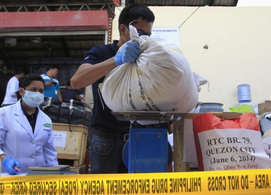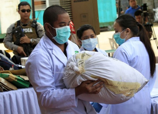 资料图片:在菲律宾甲米地省的特雷塞马蒂雷斯,菲律宾毒品管制局的工作人员给一袋缴获的毒品称重。