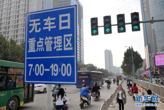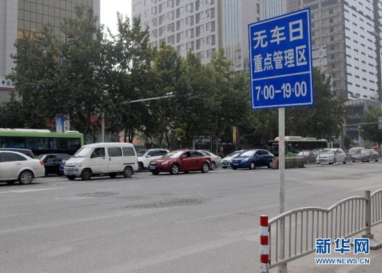 一处设置在郑州市花园路农业路交叉口的“无车日”告示牌(9月22日摄)。 9月22日是“世界无车日”,河南省郑州市在农业路(不含)以南、桐柏路(不含)以东、航海路(不含)以北、未来路(不含)以西的区域内划定了交通重点管制区域,除公交车、执勤车、特殊车辆以外,其他汽车不允许驶入。郑州交警提醒大家选择公共交通、步行、非机动车等绿色环保低碳方式出行。新华社记者 李博 摄