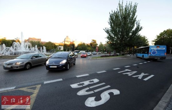 马德里卡斯特亚娜大街上的公交车与出租车专用车道标示。(资料图片)