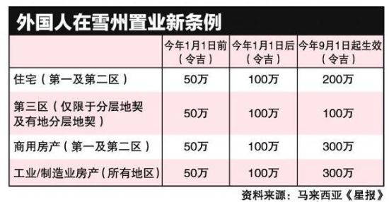 《联合早报》援引马来西亚英文报纸《星报》的报道称,新条例已从本月1日起生效,雪州政府将地区划分为三个部分,即第一区(八打灵、鹅麦、乌鲁冷岳、雪邦及巴生)、第二区(瓜雪及瓜拉冷岳),以及第三区(乌雪及沙白安南)。提价后的每个地区的房地产最低价格不一,介于100万至300万令吉(约190万到570万人民币)。