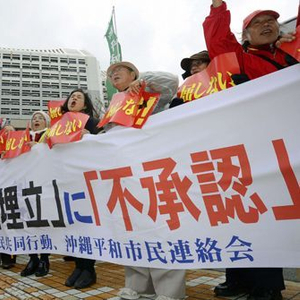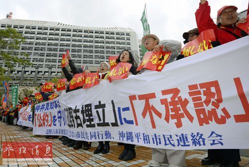 资料图片:日本民众在位于那霸的冲绳县政府大楼前抗议美军基地搬迁计划。
