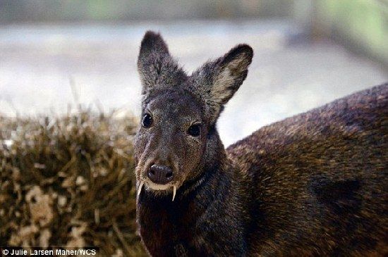 科学家认为这种动物的尖牙和象牙一样,都是雄性在发情季节,为了打败对手,赢得雌性交配权的利器。(图片来源:英国《每日邮报》)