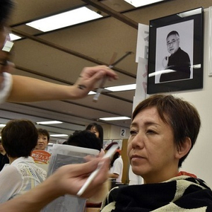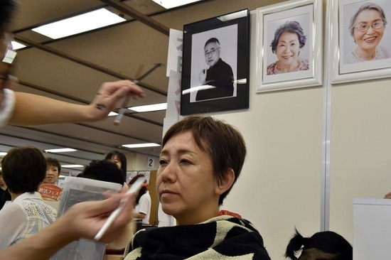 在东京举行的殡葬展览活动中,一位女士正在接受化妆服务,准备坐着照一张遗像。