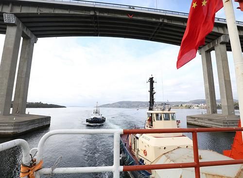 11月16日上午,“雪龙”号通过澳大利亚霍巴特标志性建筑塔斯曼大桥,在霍巴特港停靠补给物资。新华社记者 白阳 摄