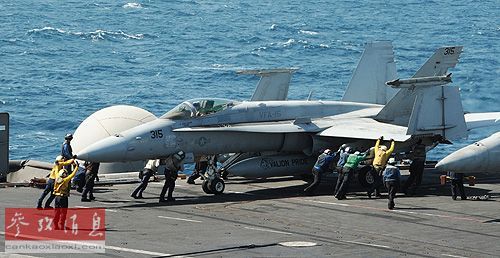这张美国海军8月8日提供的照片显示,在海湾地区执行任务的“乔治·H·W·布什”号航空母舰上,地勤人员指挥一架F/A-18C大黄蜂战斗机。美国五角大楼8月8日说,美军当天已向“伊拉克和黎凡特伊斯兰国”极端组织在伊拉克北部的目标发动空袭。两架F/A-18型战斗机参与了空袭。新华社发
