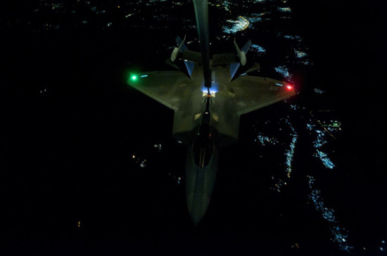 资料图:参加空袭IS的美军F-22战机正在空中加油。(图片源于网络)