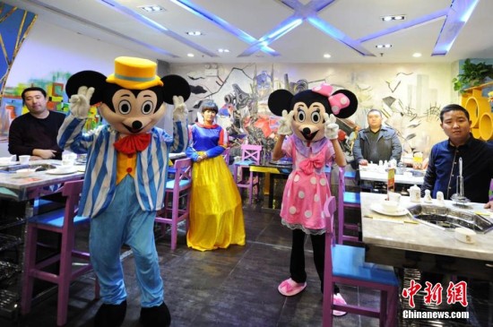 11月9日,兰州一家火锅店内以动漫为主题的特色场景与服务吸引市民。据了解,这家火锅店打破传统装修风格,以炫酷电影动画为主题环境,服务员妆扮成米老鼠、白雪公主等动漫人物形象为食客服务。杨艳敏 摄