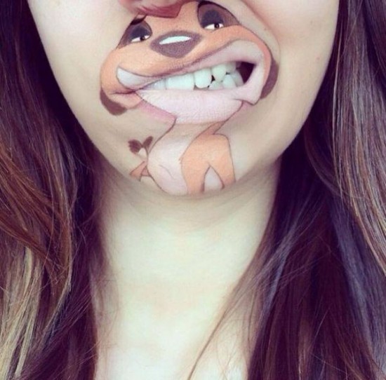 劳拉在自己嘴唇周围画的卡通人物包括兔八哥、大力水手、高飞和《狮子王》中的丁满和彭彭等。劳拉将这些化妆作品发到网上后,得到了众多网友的支持。(徐雨轩)