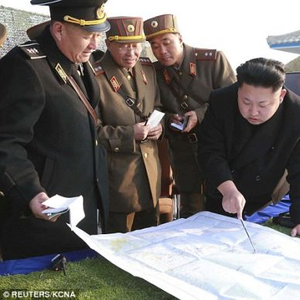 金正恩在朝鲜军队在朝鲜海岸进行联合训练,图为朝鲜高级军事顾问正听取金正恩指示。(图片来源:朝中社)